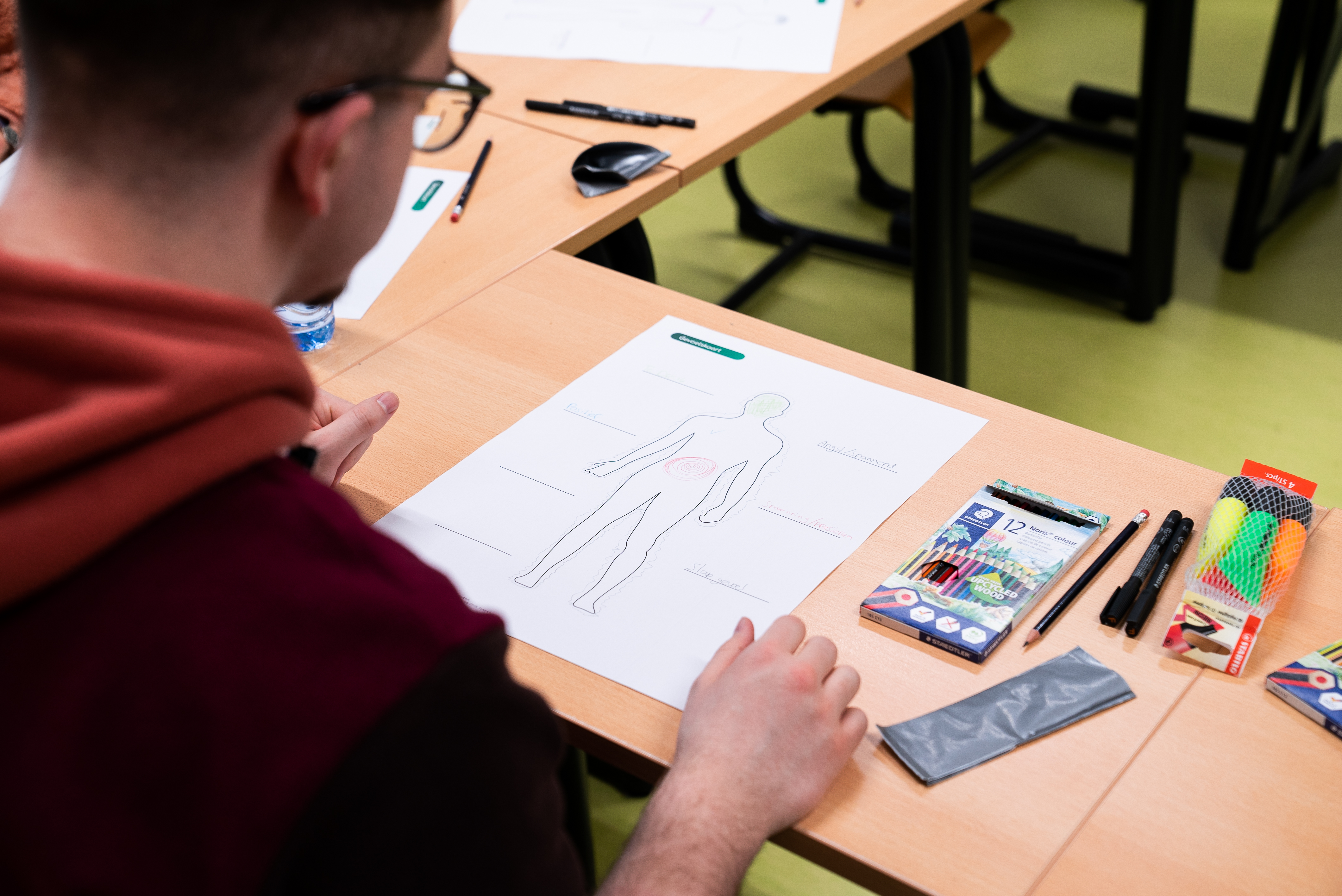 Jarno was, na het invullen van de bodymap, voor het eerst bewust bezig met lichaamssignalen die opspelen bij zijn stresservaring.