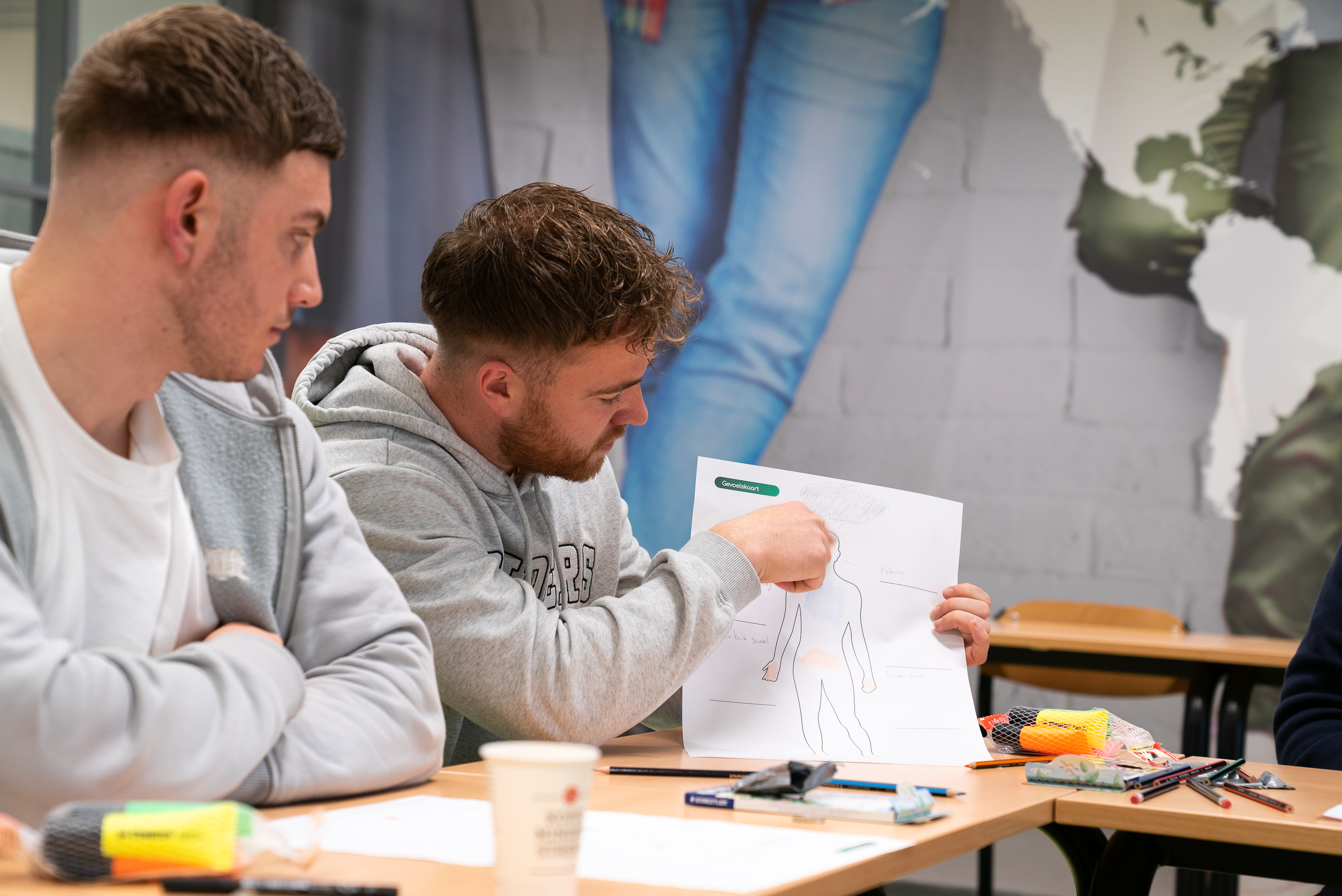 “We probeerden samen in mijn bodymap te ontdekken wat de anderen zagen, zonder daarbij steeds naar mij te kijken als ik het probeerde uit te leggen.” Net als deze student was het voor de groep niet moeilijk de bodymap in te vullen. Ik ontdekte geen enkele aarzeling bij het invullen ervan, ondanks de soms beladen of sterk aanwezige gevoelens. Zo vertelde een andere student: “Het is erg confronterend omdat ik het zelf nog geen plek heb gegeven. Daarom is het ook heel fijn om er nu over te kunnen praten. Ik vind niet dat ik mezelf zwak opstel, maar met mijn huisgenoten zou ik het er niet over hebben omdat ik me ervoor schaam.” vertelde Ulas na afloop aan de sessie.