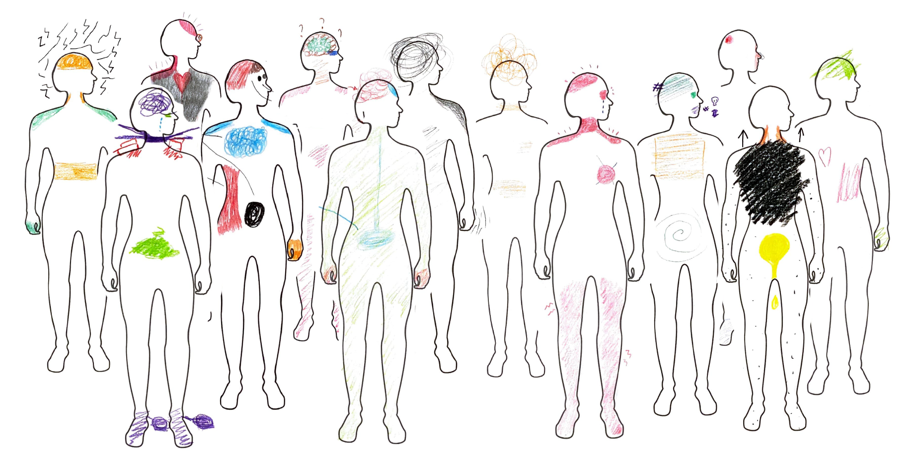 De bodymap gebruik ik als visueel middel die de studenten kunnen intekenen als representatie van hun eigen lichaam. Het zorgt ervoor dat studenten zich richten op hun gevoel en hier een eerste poging doen om dit vast te leggen en zo communiceerbaar te maken. Hierbij vraag ik hen nog niet om hier direct woorden aan te geven, maar hun eigen visuele beeldtaal te gebruiken die hun stress op een juiste wijze representeert. Het geeft ze daarbij de vrijheid dit te doen in kleur, symbolen, vorm, etc. waarbij intuïtief en vanuit het gevoel gecreëerd wordt.